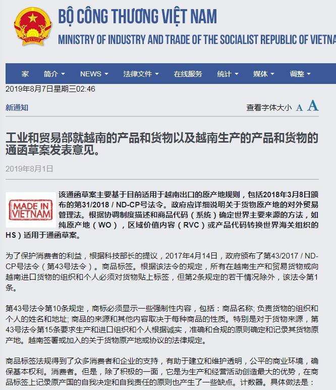 此前,越南工业贸易部发布的“越南制造”(原产地)标准草案规定: